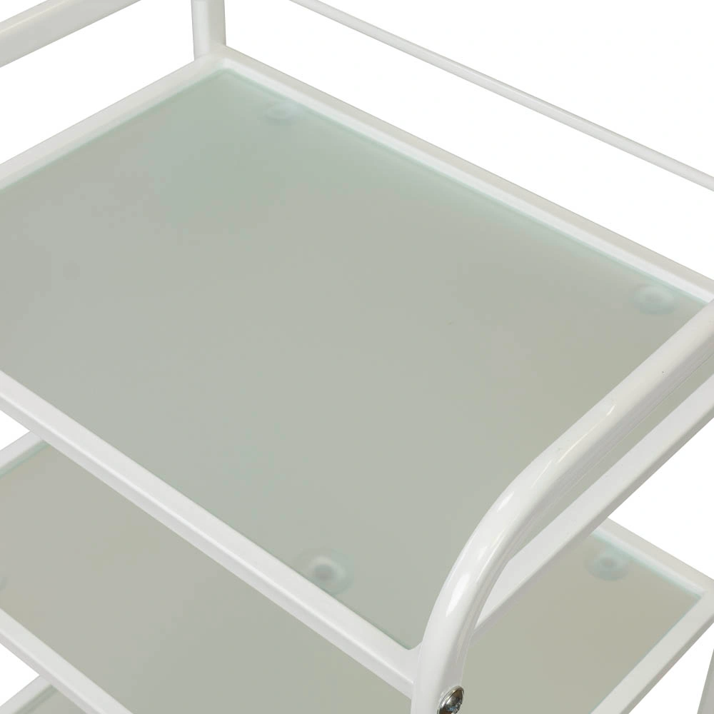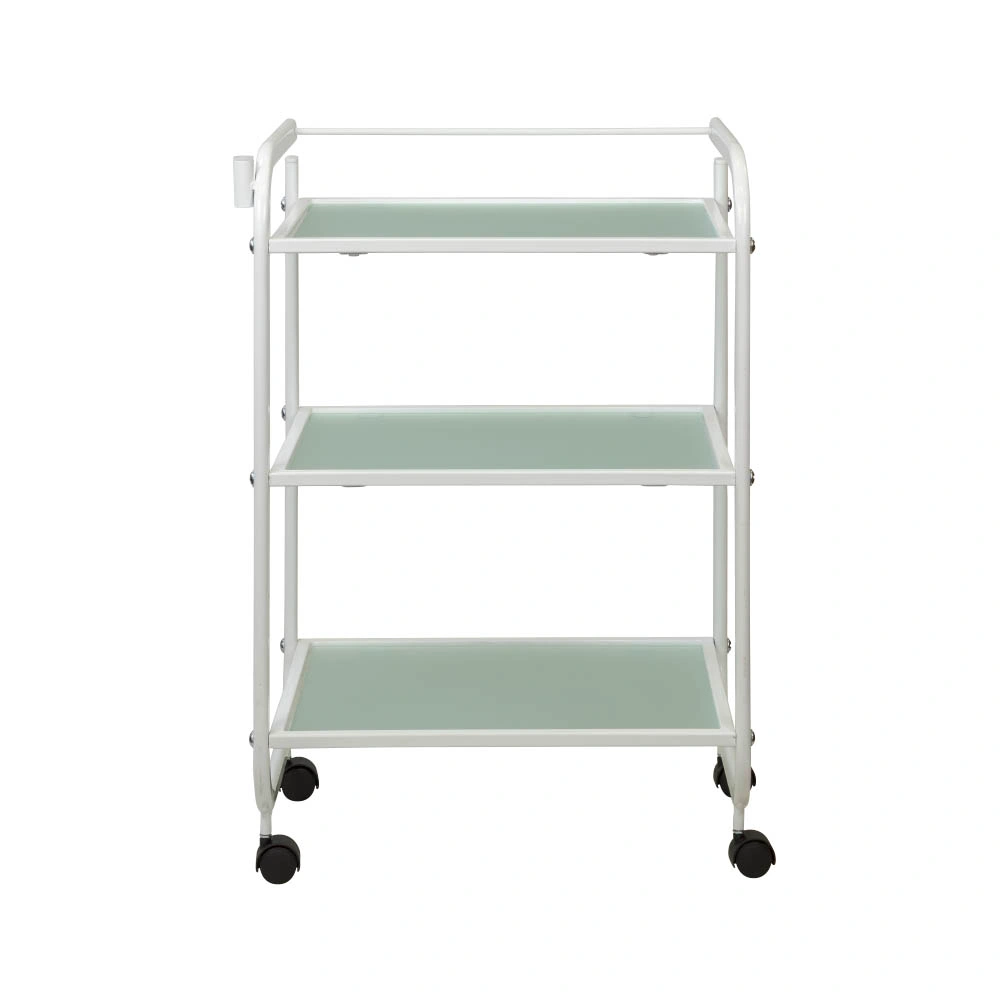 Комплектация: металлический каркас, три стеклянные полки с бортиками, колеса.