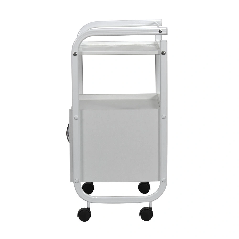 Мобильная косметологическая тележка МД-104 – выгодное и необходимое приобретение для рабочего кабинета. Это современная модель, для производства которой используются качественные, долговечные материалы. Каркас и все крепежные элементы металлические, защищены от коррозии специальным влагоотталкивающим покрытием. Встроенная тумба из ЛДСП белого цвета, внутри разделена вертикальной перегородкой на две ниши, закрывающиеся дверками с хромированными ручками. Верхняя полка из листа металла, с бортиками для удобного размещения инструментов.