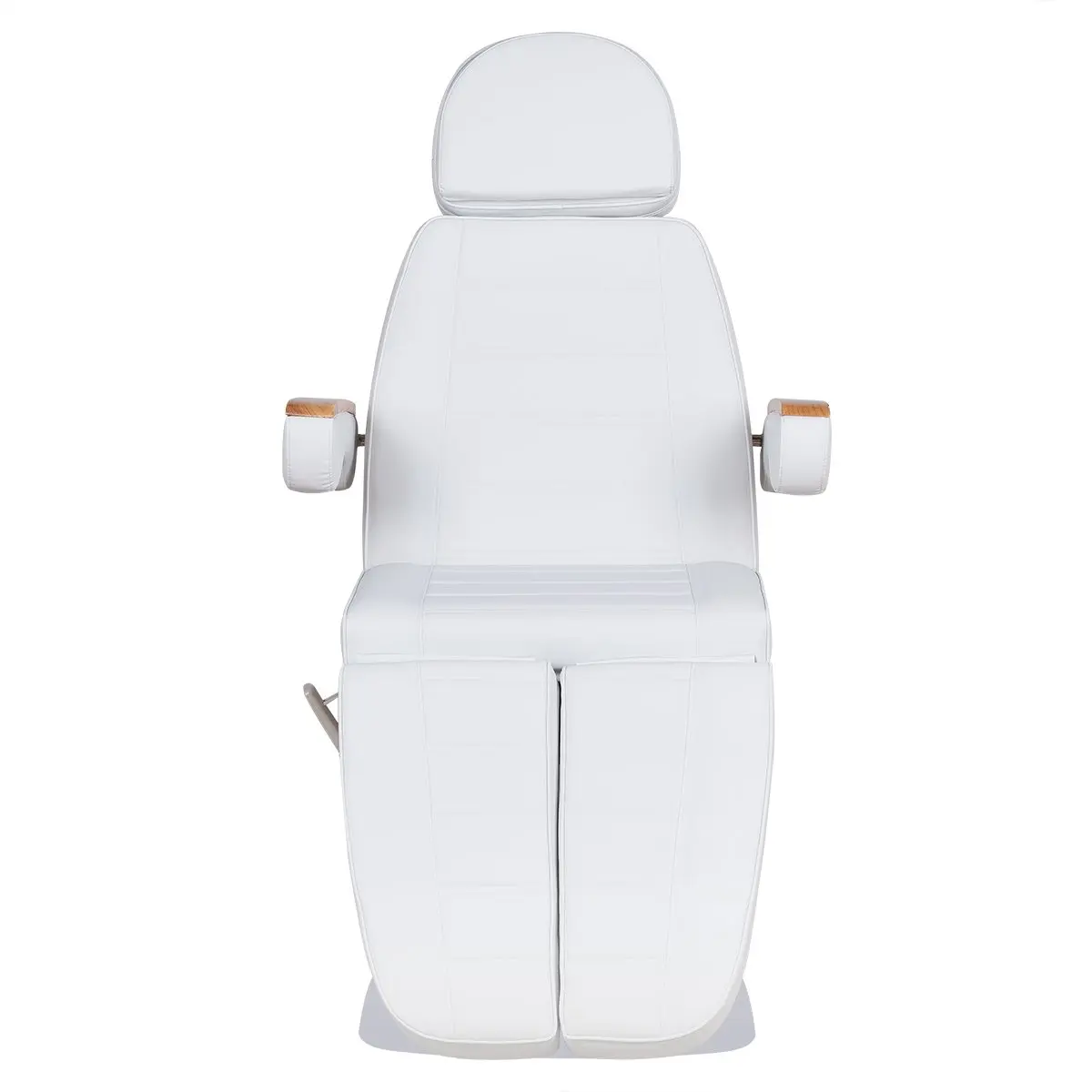 Кресло имеет устойчивое широкое основание, конструкция полностью раскладывается в горизонтальное положение, имеются выдвижной подголовник с отверстием для лица, которое при необходимости можно закрыть мягкой подушкой и съёмные подлокотники со стильными деревянными вставками. Модель можно использовать для различных процедур: педикюр, наращивание ресниц, косметология, оформление бровей и т.д.